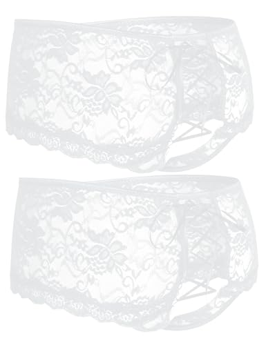 ohyeahlady Womens Lace French Knickers Soft Stretchy Bikini Briefs Back Cross Thongs Hipster Pantie Plus Size Cheeky Underwear Multipack 2Pack White