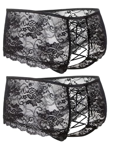 ohyeahlady Womens Lace French Knickers Soft Stretchy Bikini Briefs Back Cross Thongs Hipster Pantie Plus Size Cheeky Underwear Multipack 2Pack Black