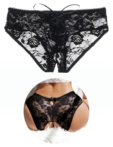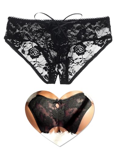 ohmydear Lace French Knickers Plus Size Crotchless Underwear for Women Sexy Panties Sheer Mesh Ladies Pants Cheeky Bikini Briefs Frilly Black Thongs Pantys Uk 14