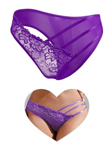 ohyeahlady Women's Lace Tangas Panties Sexy Micro Thongs for Bedroom Curvy Hipster Asymmetrical Bikini Briefs French Brazilian Knicker Cheeky Underwear Purple L