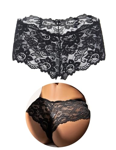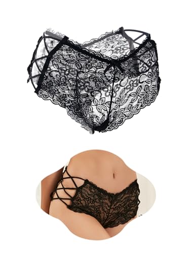 comeondear French Knickers for Women Cross Bands V-Shaped Design on the Back Lace Thongs Knickers Low Tangas Cheeky Panties Soft Stretchy Plus Size Low Waist Briefs Black 12 14