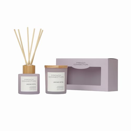 French Connection Pastel Collection Scented Reed Diffuser & Candle Gift Set | Luxury Home Fragrance | (Set-100ML & 141G, Sea Salt & Coconut) (Lavender and Cedarwood)