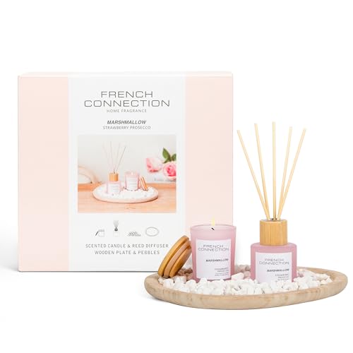 French Connection Marshmallow Home Fragrance Gift Set | Scented Candle & Reed Diffuser with Wooden Plate & Pebbles | Luxury Aromatherapy Set | (Small)