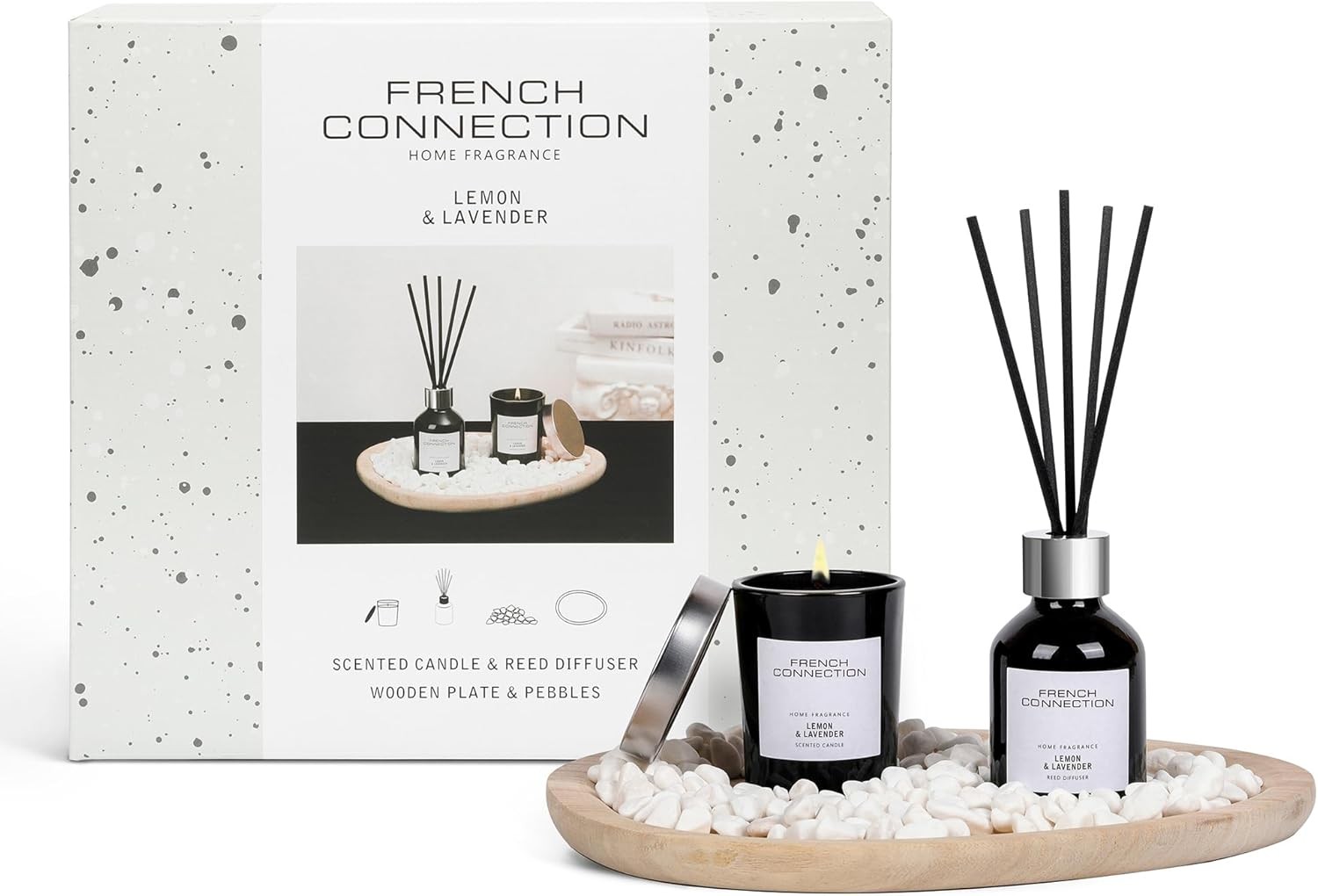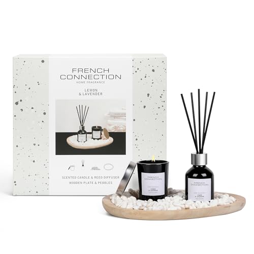 French Connection Home Fragrance Gift Set | Scented Candle & Reed Diffuser with Wooden Plate & Pebbles | Luxury Aromatherapy Set | (Lemon & Lavender)