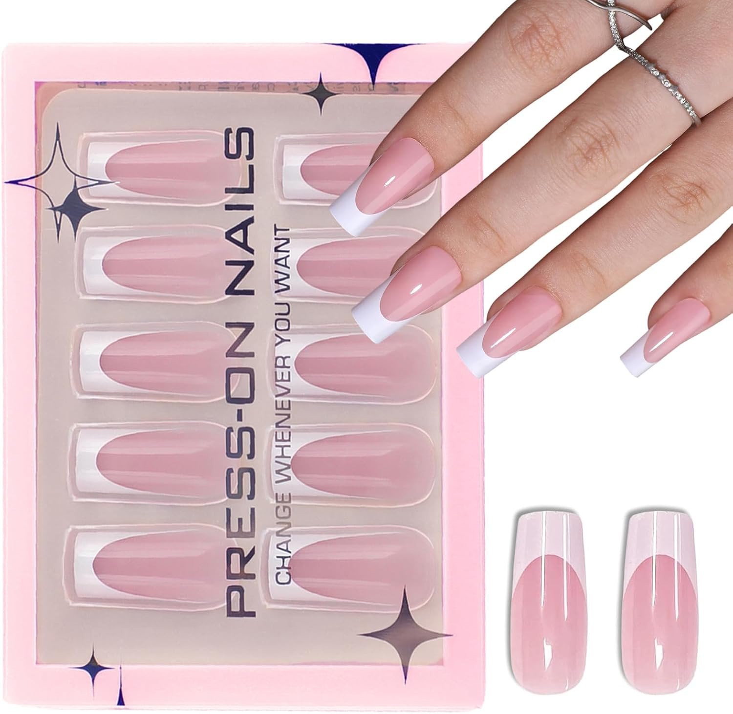 French False Nails - Medium Long Press on Nails Square - Nude Pink French Tip Fa