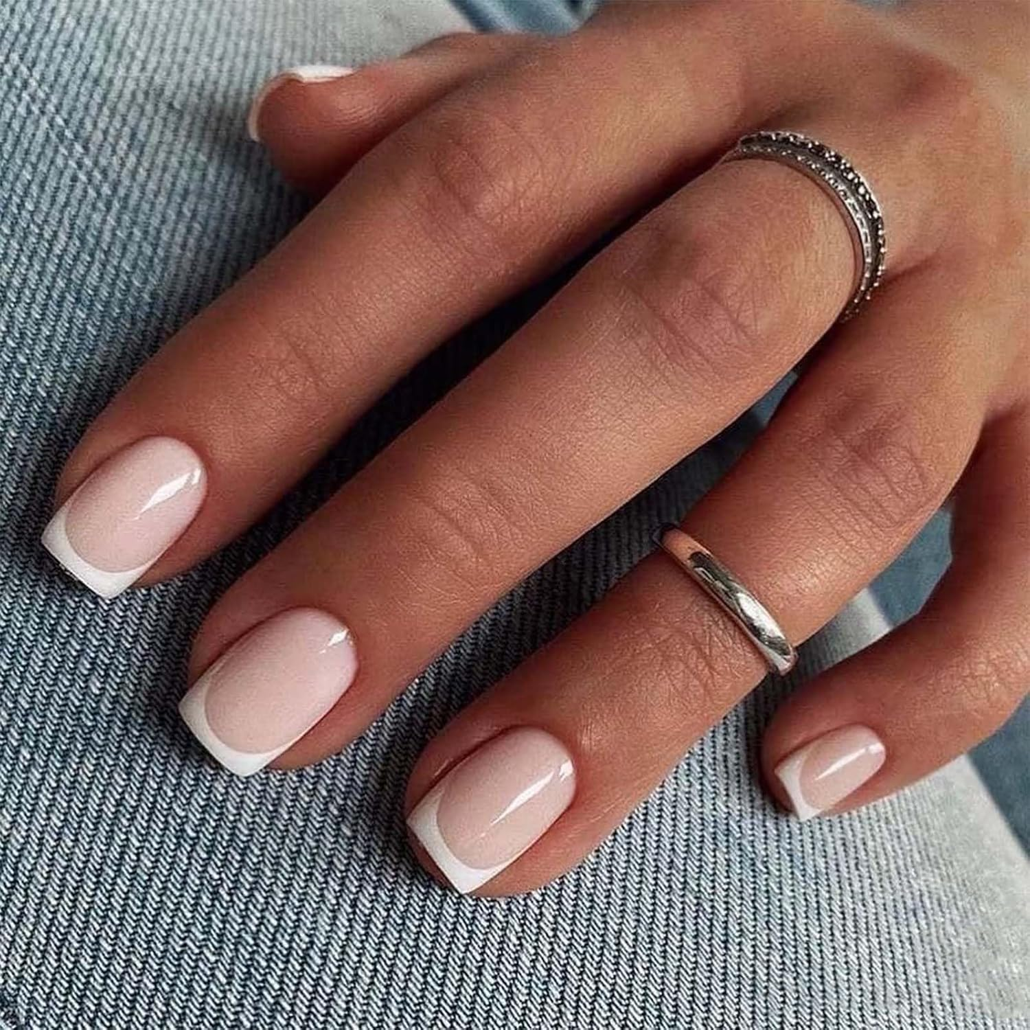 Press on Nails, 24 Pcs French Tip False Nails Square, Stick-On-Nails Short, Fake