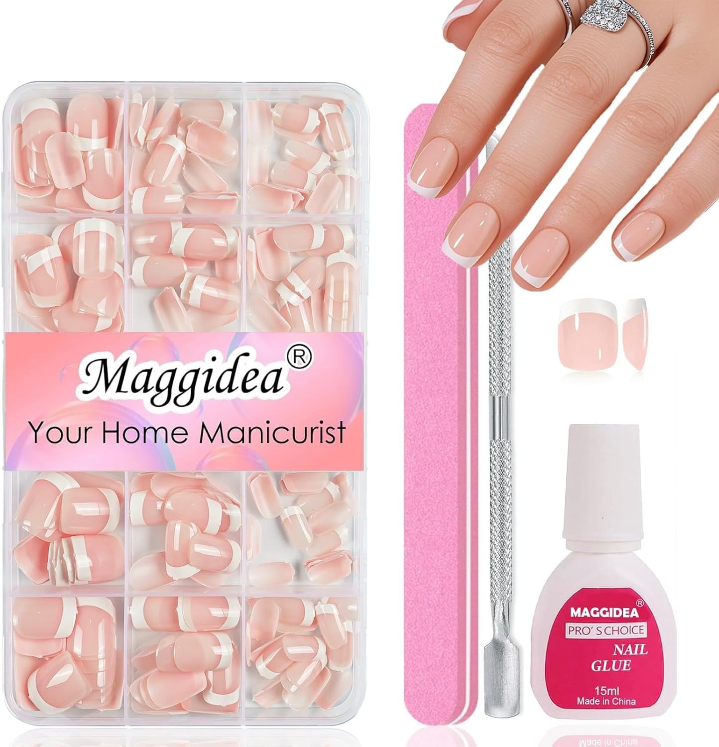 French Tip False Nails - Short Almond False Acrylic Nails with Nail File & Adhes