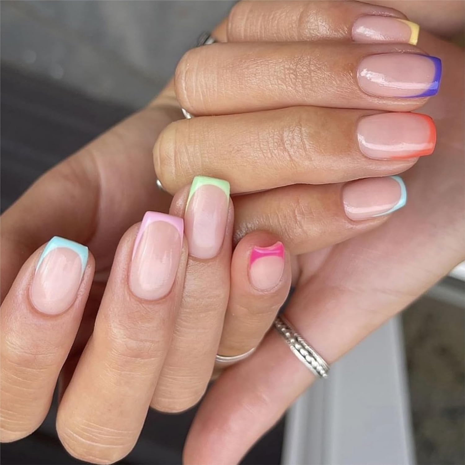 Short French Tip False Nails - Pastel French Tip Press on Nails Square Shape - C