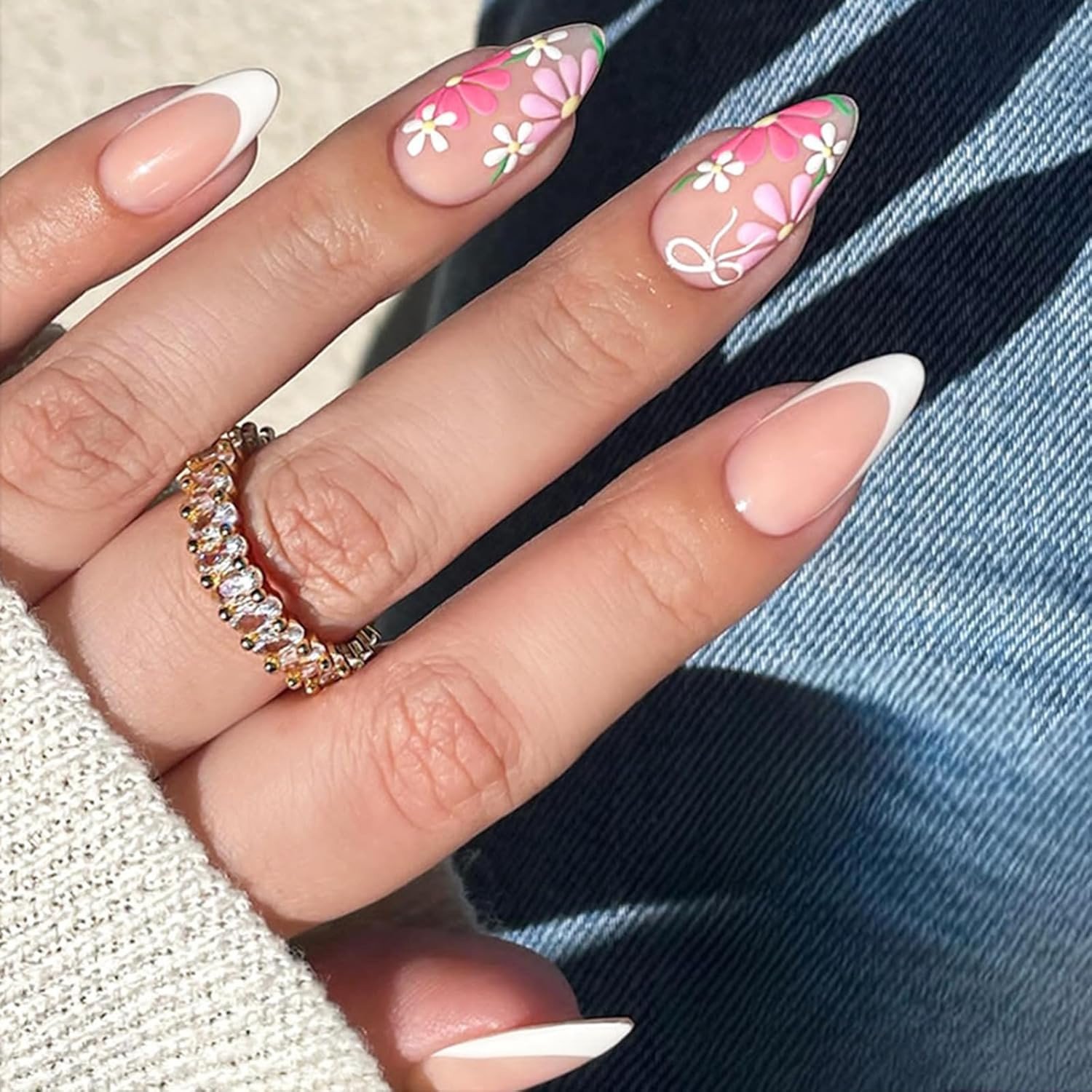 French Tip False Nails - 24Pcs Short Almond Press on Nails with Cute Flower Desi