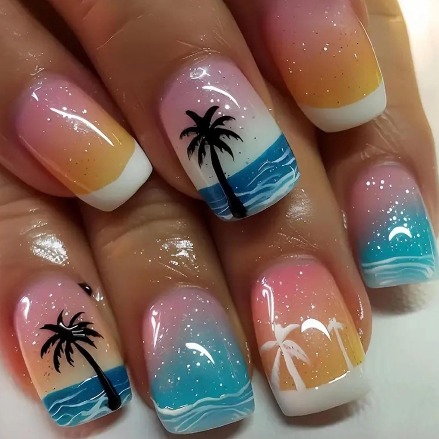 24PCS Summer Beach Press on Nails – Short French Tip Style with Dream Island Pat