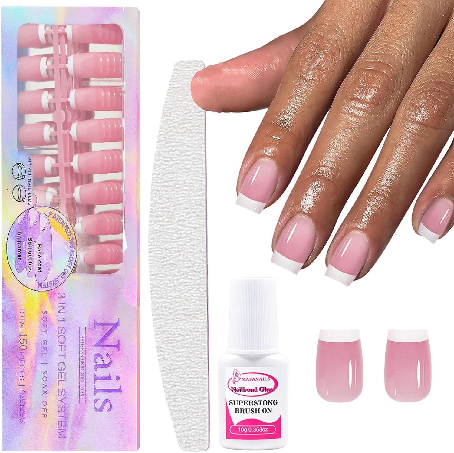 French Tip False Nails Kit - 150Pcs French Tip Press on Nails Short - 3 in 1 Sof