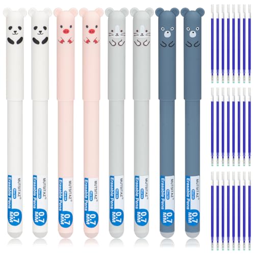 Mutsitaz Erasable Pens Blue Ink – 8pcs Cute Animal Friction Pens with 24 Refills, 0.7mm Rub Out Gel Pen for School & Office Supplies