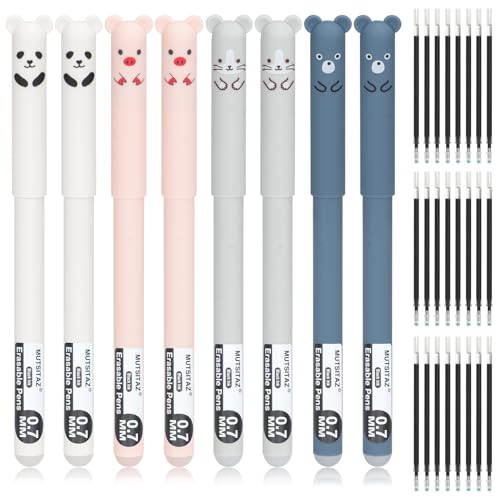 Mutsitaz Erasable Pens Black Ink – 8pcs Cute Animal Friction Pens with 24 Refills, 0.7mm Rub Out Gel Pen for School & Office Supplies