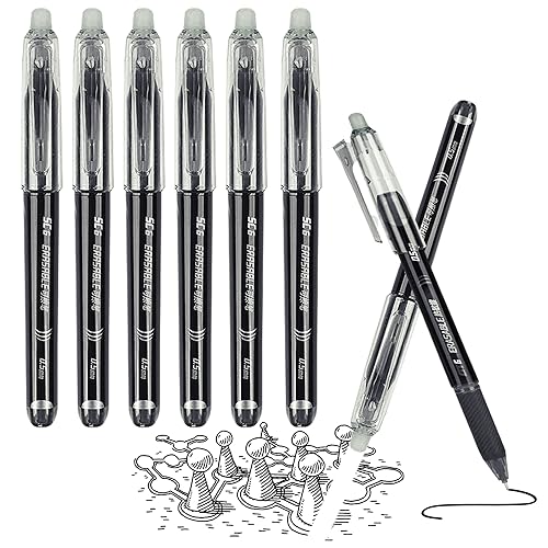 Surcotto 6pcs Erasable Pens Black, Friction Pens with Rubber, Rub Out Pen with Eraser, Eraser Pen for Kids Adults School Writing Stationary Supplies, Erase Clean Easily, Paper Harmless
