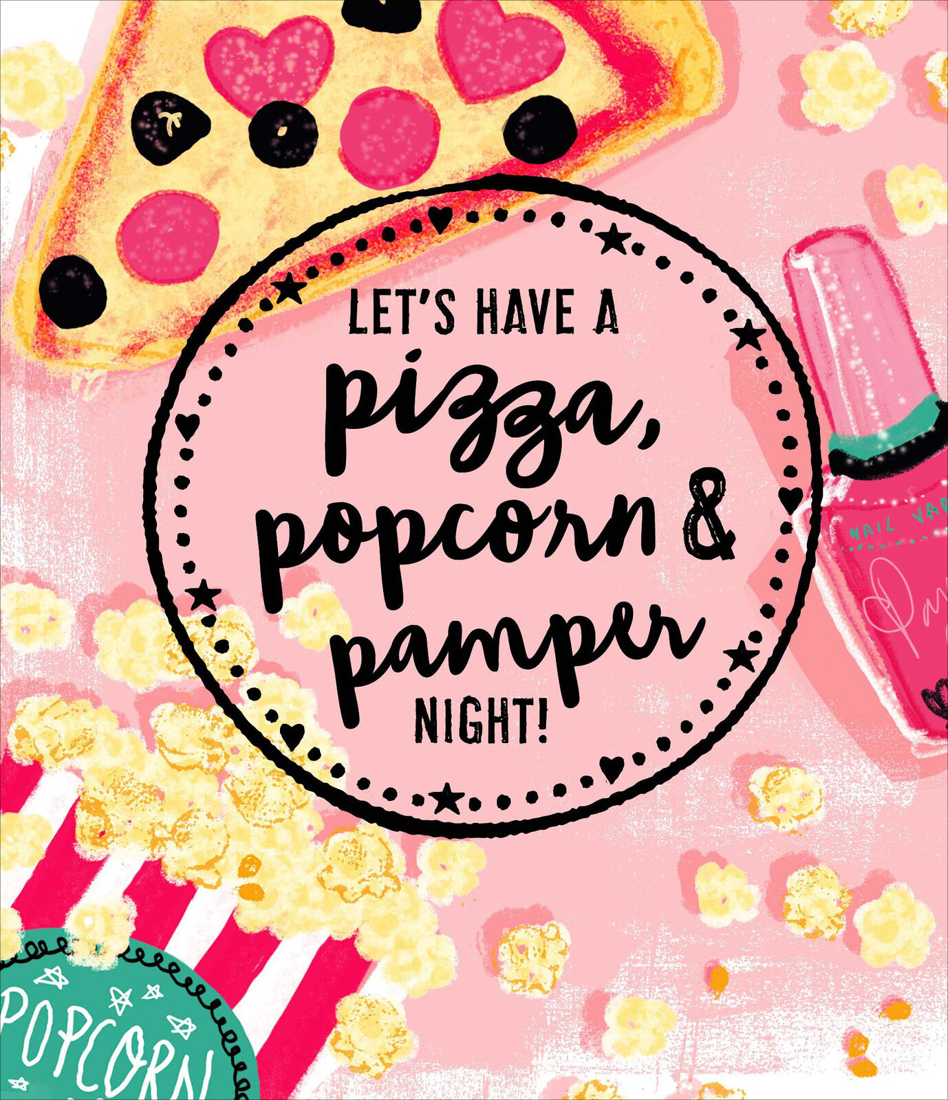 Pizza Popcorn & Pamper Night Friend Valentine's Day Greeting Card Glitter Cards