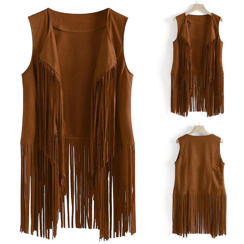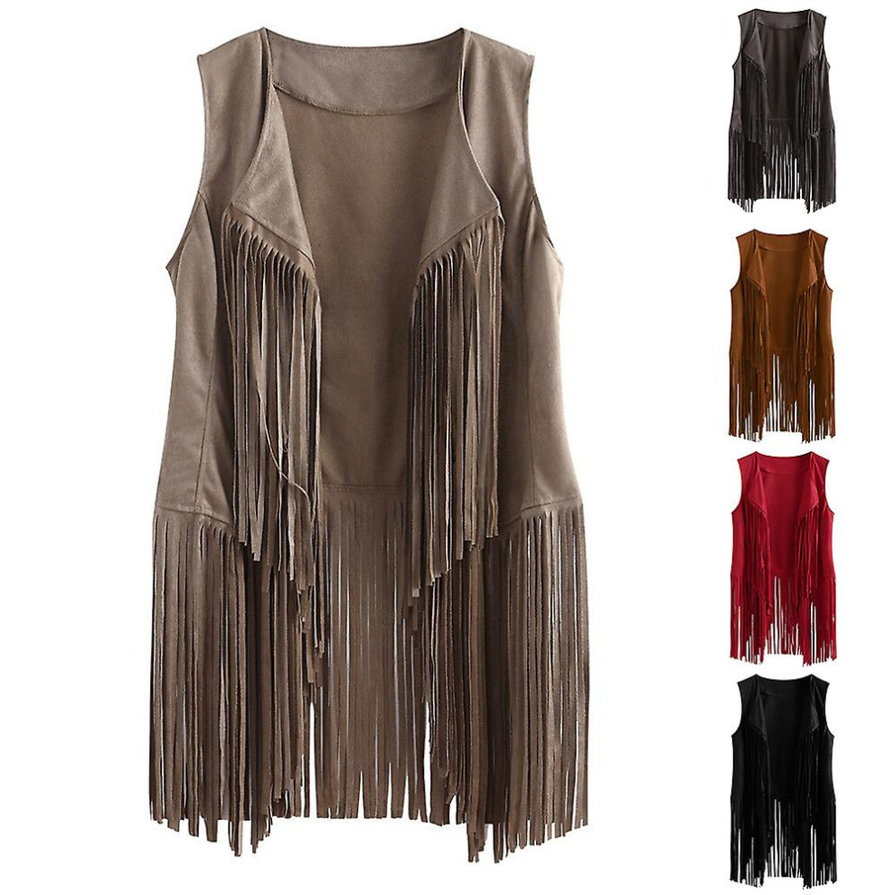 (Khaki, L) Women's Cowboy Cowgirl Tassel Sleeveless Vest 70s Hippie Fringe Jacket Cardigan Coat Top