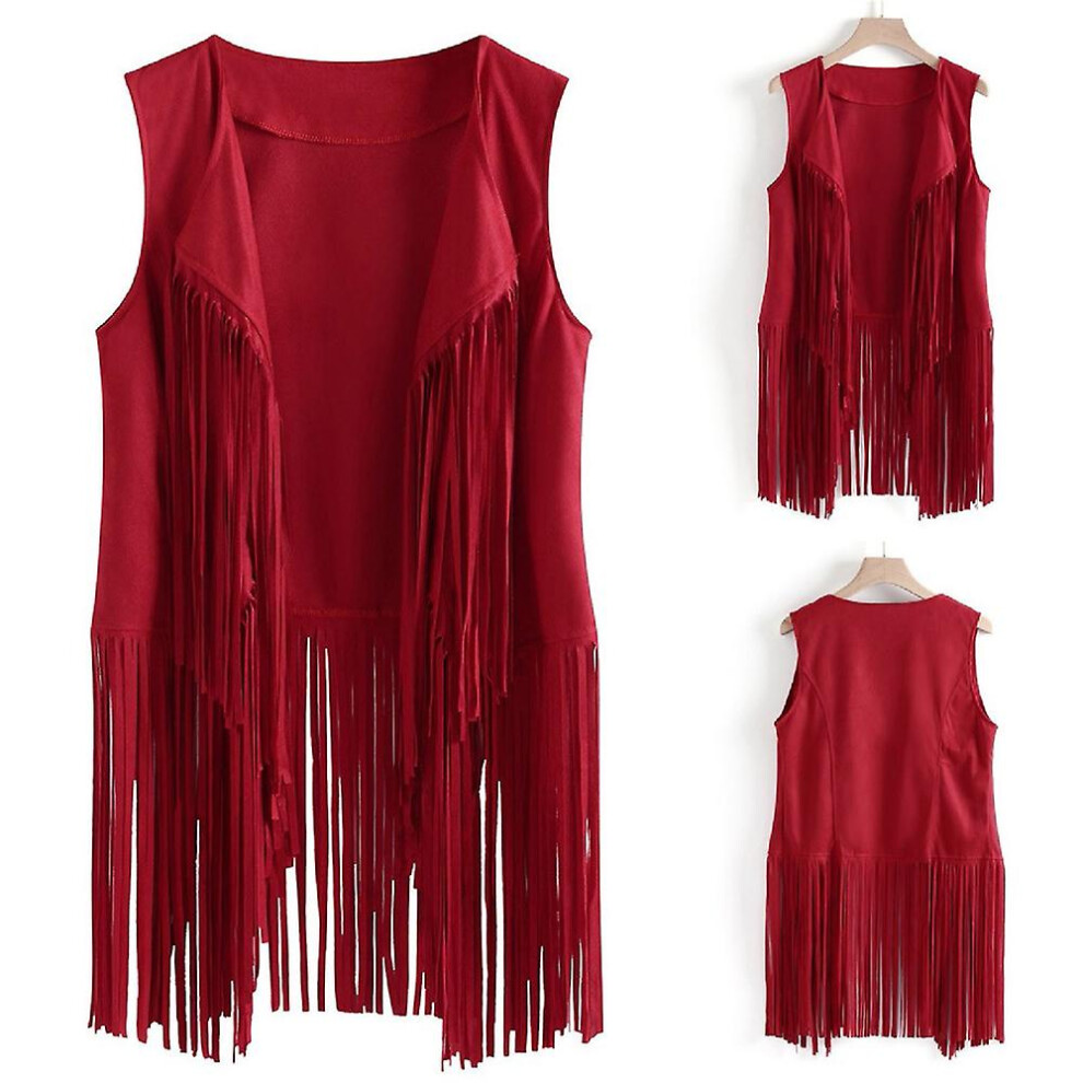 (Red, L) Women's Cowboy Cowgirl Tassel Sleeveless Vest 70s Hippie Fringe Jacket Cardigan Coat Top