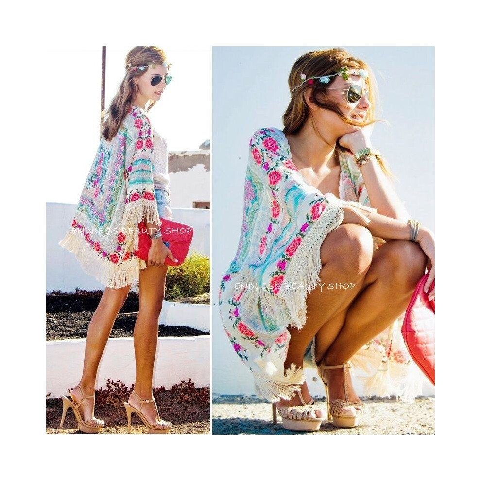 New Fashion Women Boho Fringe Floral Kimono Cardigan Tassels Beach Cover Up Cape Jacket