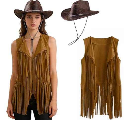 Women Cowgirl Costume Outfit Cowboy Hat Set Women's Tassel Vest 70s Fancy Dress Women Disco Top Hippie Clothes Costume Faux Suede Fringe Jacket Cardigan Sleeveless Jacket 60s Fancy Dress for Men Adult