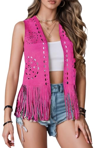 Qtinghua Women's Tassel Vest Hippie Faux Suede Fringed Waistcoat Open Front Sleeveless Y2k Jacket Cardigan Cowgirl Top Streetwear (Pink, S)