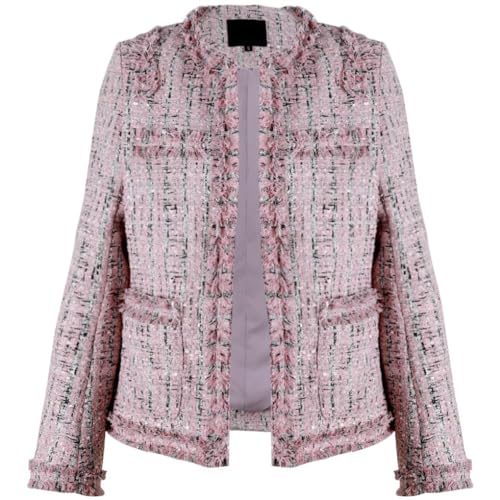 Leyoutx Women's Collarless Plaid Tweed Blazer Elegant Open Front Fringed Casual Business Glitter Jacket, Pink, XS