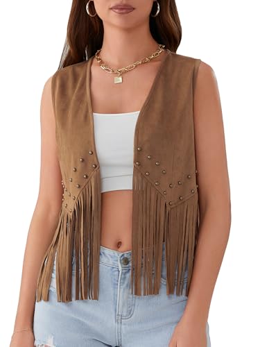 Women Summer Cowgirl Tassel Waistcoat Suede Rivets Sleeveless Fringed Jacket 70s Western Hippie Country Vest (F-Light Brown, M)