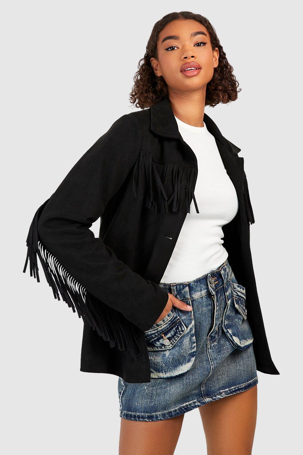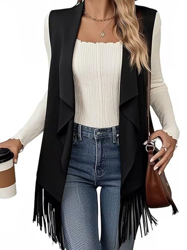 FEOYA 70s Long Fringed Waistcoats Tassel Women Cow Girl Outfit Suede Fringed Jacket Black M Hippie Costume