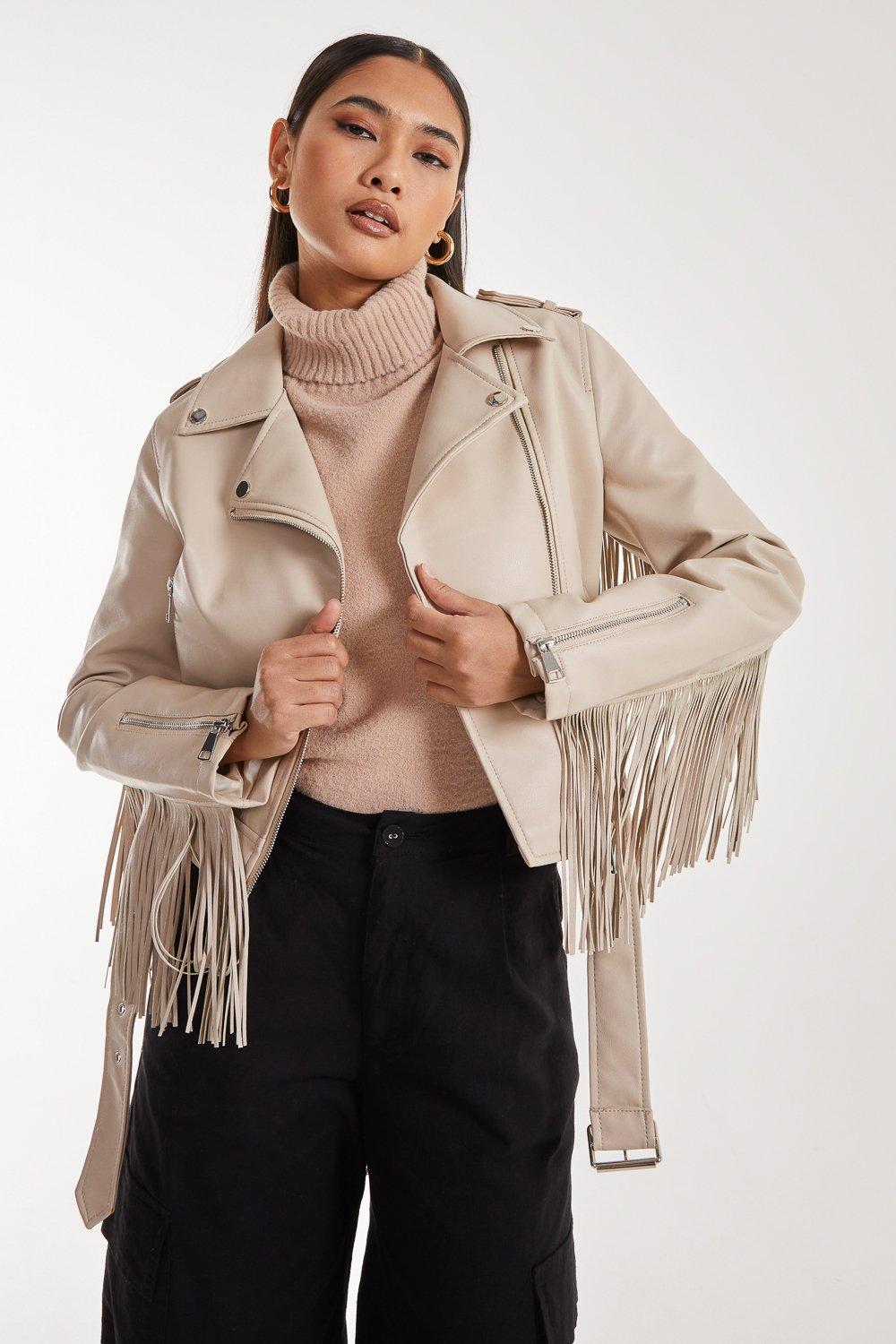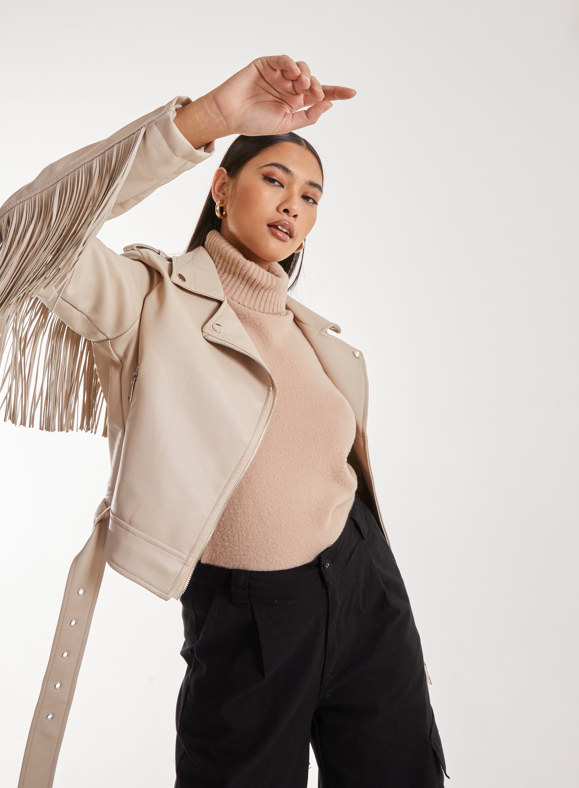 Pink Vanilla Womens Fringed Cropped PU Jacket - Stone - Size 8 UK