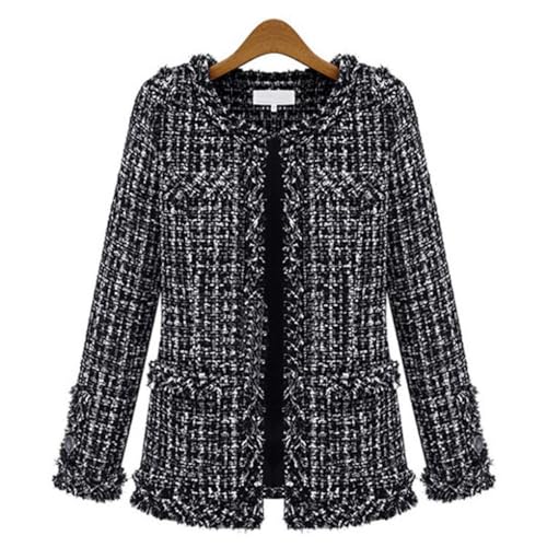ebossy Women's Elegant Open Front Round Neck Fringed Plaid Tweed Jacket, Black, XL