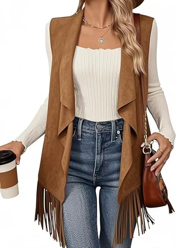 Qtinghua Women's Tassel Vest Hippie Faux Suede Fringed Waistcoat Open Front Sleeveless Y2k Jacket Cardigan Cowgirl Top Streetwear (Dark Brown, L)
