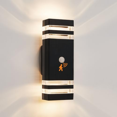 Bojim Outdoor LED Wall Lights Mains Powered with Motion Sensor, Dusk Till Dawn Outside Black Porch Light, Up and Down Front Door Light, IP65 Waterproof for Garden, Garage, Patio, Modern, Aluminium