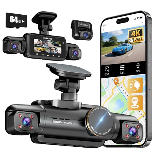 Vasip 4K Dash Cam Front and Rear Inside, 5GHz WiFi, 3 Channel Dash Cam for Cars, 3.16” IPS Dash Camera for Cars with 64GB SD Card, Night Vision, WDR, G-Sensor, Loop Recording, 24H Parking Mode