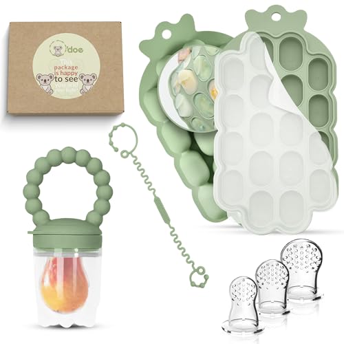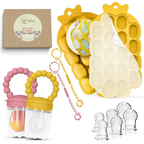 O’doe Silicone Fruit Feeder for Babies & 2 Baby Food Feeder with 2 Clip | 1-Pack Freezer Tray with Lid, 18-Hole Teething Dummy Fruit Feeder for Teething Relief, 6 Extra Pacifiers, BPA-Free