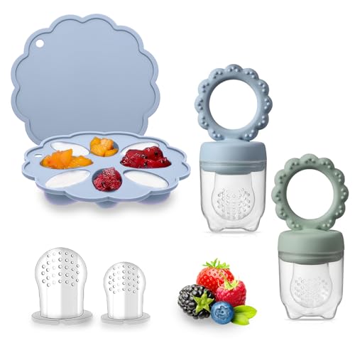 Fruit Feeder for Babies (4M+) - Includes Teething Dummy & Breast Milk Freezer Mold, BPA Free Fruit Feeder Pacifier for Baby Weaning Gum Soothing & Self-Feeding (Blue Tray/Green, 3Pack)