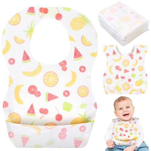 Vaktop Disposable Bibs, 30 Pack Disposable Bibs Baby with Food Catcher Pocket, Waterproof Baby Feeding Bib, Adjustable Babies Bib for Toddlers Boys Girls Travel Outdoor (Fruit)