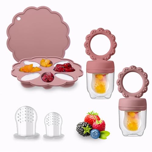 Fruit Feeder for Babies (4M+) - Includes Teething Dummy & Breast Milk Freezer Mold, BPA Free Fruit Feeder Pacifier for Baby Weaning Gum Soothing & Self-Feeding (Pink/Purple, 3Pack)