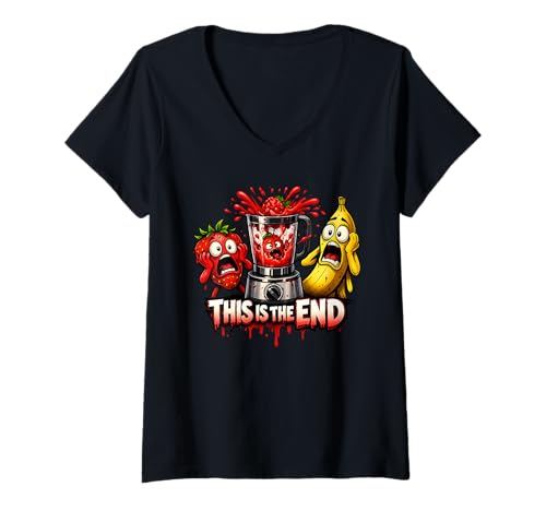Women's Funny Comic Fruit Panic Blender Design Cartoon Humor V-Neck T-Shirt