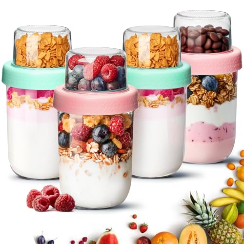 ComSaf 480mL Overnight Oats Jar with Lids, 4 Pack 16oz Breakfast Pots, Dual-Layer Overnight Oats Container for Dry-Wet Separation, Yoghurt Pots for Yogurt Fruit Nut, Cereal Cup on the Go for Granola