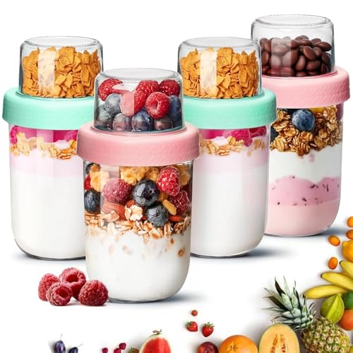 ComSaf Overnight Oats Jar with Lids 480+120mL, 4 Pack Glass Overnight Oats Container, Dual-Layer Yoghurt Pots for Dry-Wet Separation, Breakfast Pots for Yogurt Cereal Fruit, Glass Mason Jars for Salad