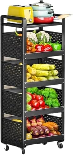 Erhigher Fruit Vegetable Storage Basket, Stackable Mesh Storage Basket with 360 Degree Wheels, Fruits Vegetables Storage Basket Cart, Pantry Organizer Rack with Detachable Basket Black Four Layer