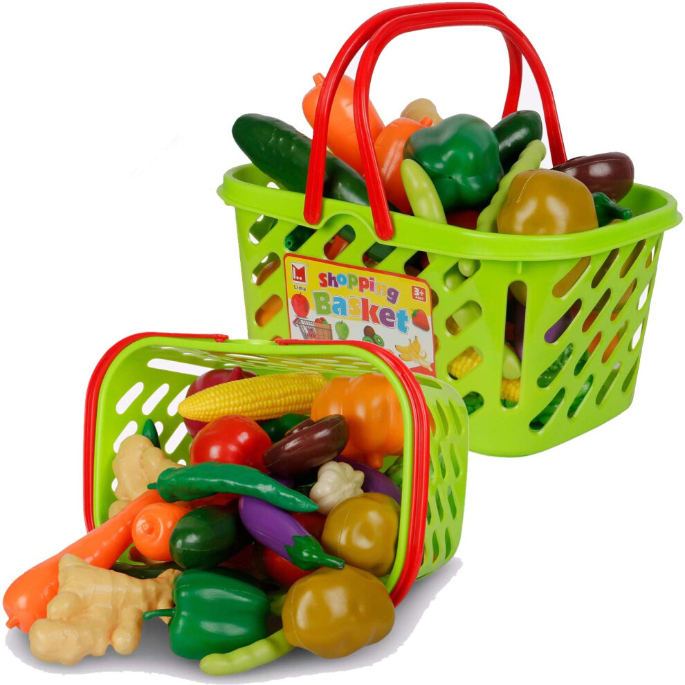 Liberty Imports 38 PCS Fruits and Vegetables Shopping Basket Healthy Farmer's Market Grocery Pretend Play Food Plastic Toy Set for Kids