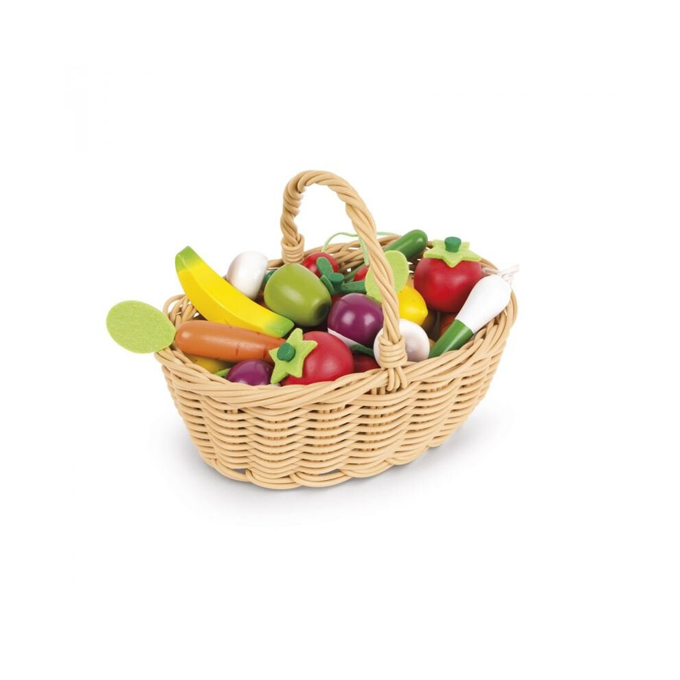Janod - 24-Piece Fruits and Vegetables Basket - Imitation Shopping Basket - Ideal for Playing Merchandising - From 3 Years Old, J05620