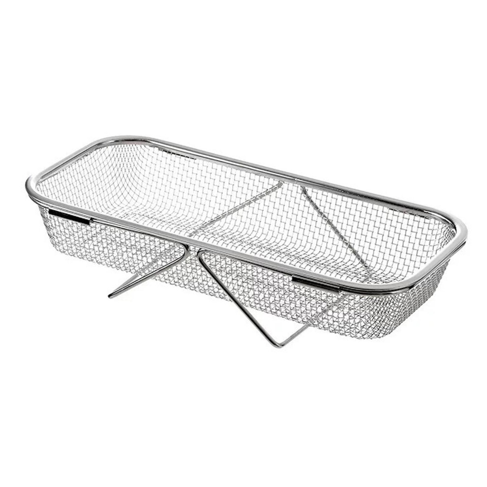 Versatile finemesh stainless steel basket with rubber grip for washing fruits and vegetables. Basket features a concave net, Style 1.