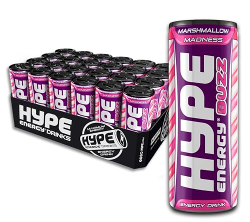 Hype Energy BUZZ MarshMallow Madness Energy Drink - 24x250ml | Caffeine Content, Taurine & 5 x B-Vitamins | Vegan, Gluten Free | Power Up & Fuel Your Day with berrylicious marshmallow