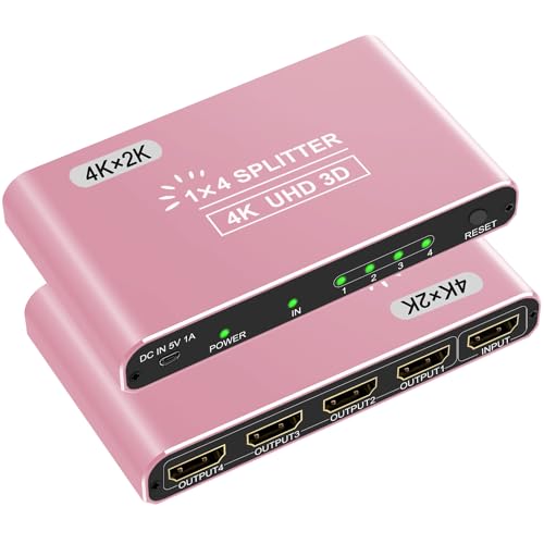 HDMI Splitter 1 in 4 Out, 4K@30Hz 4-Port Hub for 4 Monitors, Supports 3D, Full HD 1080P, Aluminum Design, Compatible with PS4, Fire Stick, HDTV (1 Source to 4 Displays, Mirroring Only) - Pink