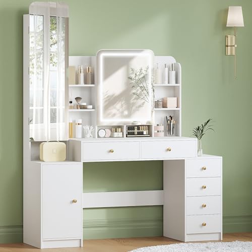 Hzuaneri Dressing Table with LED Lighting, Adjustable Brightness, Vanity Desk with Full Length Mirror, Vanity Table with 8 Open Spaces, 6 Drawers, 1 Storage Cabinet, White DT41803XUK