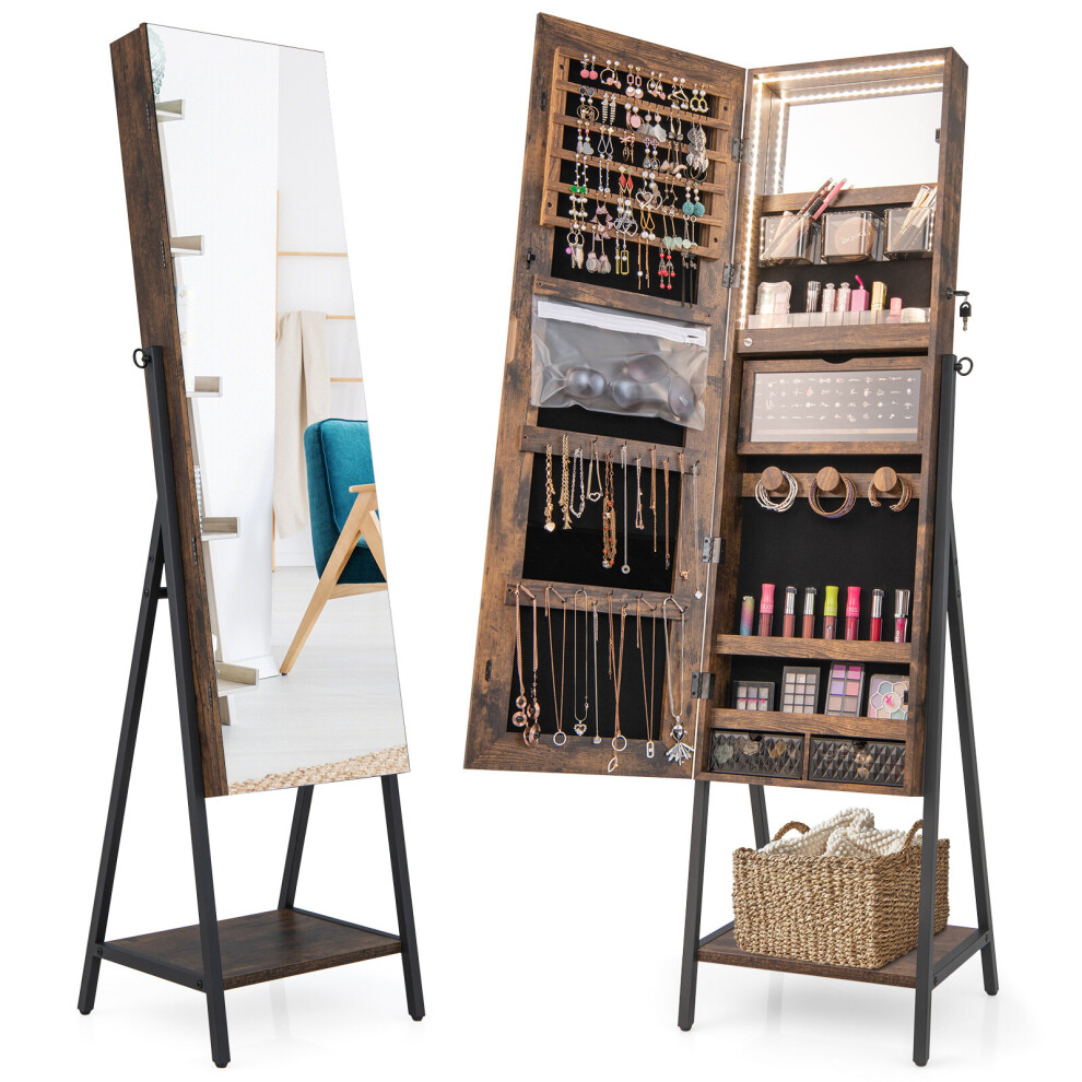 HOMCOM Freestanding Mirror Jewelry Cabinet with LED Lights, Jewellery Organiser with 3 Angle Adjustable, Full-Length Mirror with Storage for Earrings, Necklaces, Rings and Lipsticks, Rustic Brown