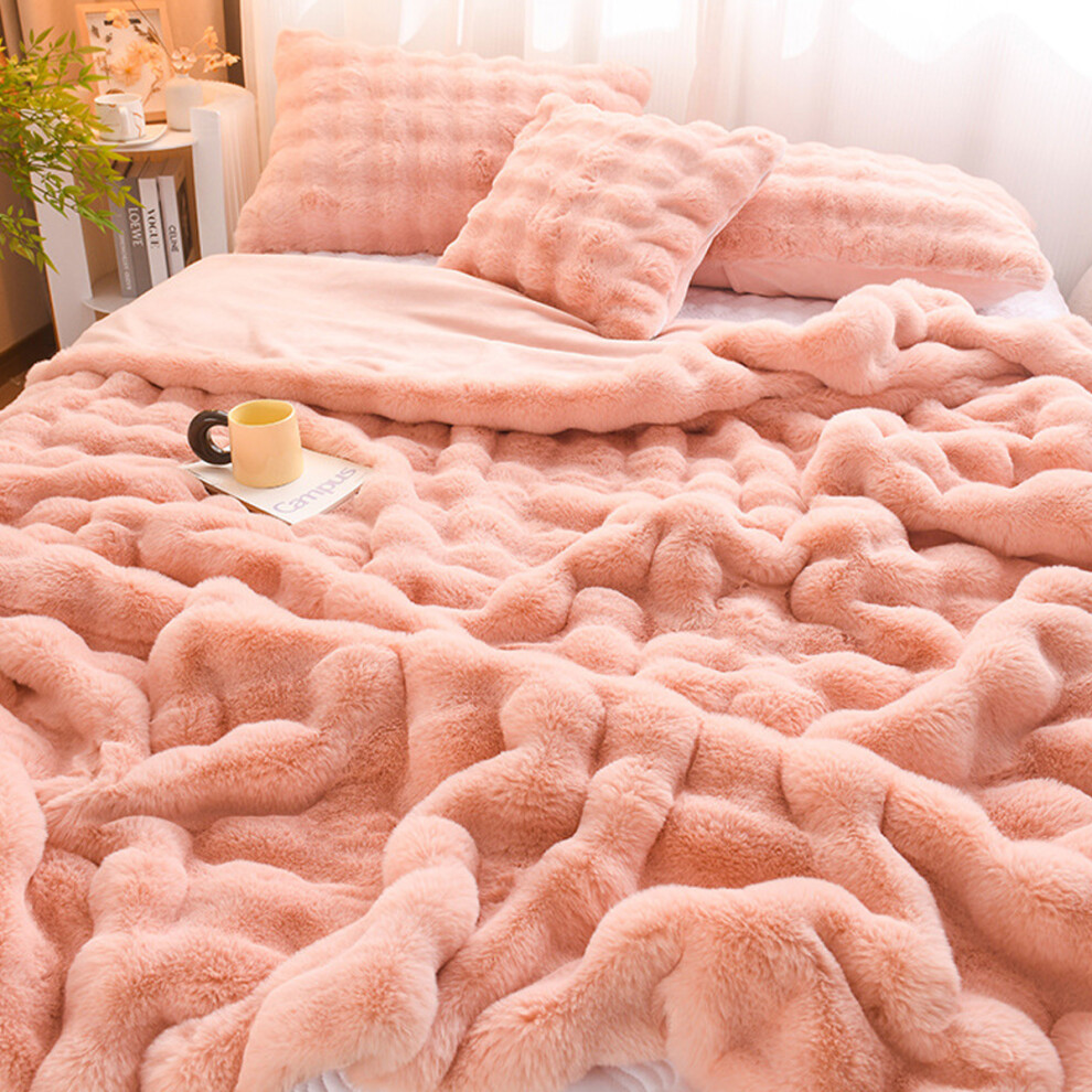 Faux Fur Blanket Bubble Blanket Faux Rabbit Fur, Double-Face Thick, Iridescent Pink 160x200 cm For Bed And Sofa