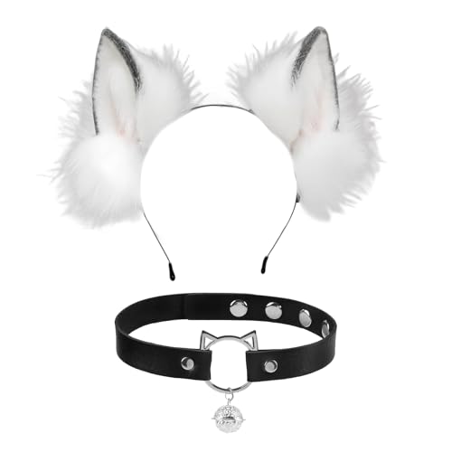 Ximinwzm Handmade Faux Fur Cat Ear Headband and Black Bell, Cosplay Animal Ear Headband Costume Accessory, Fluffy Wolf Fox Cat Ears Headbands for Halloween, Cosplay Accessories (white)