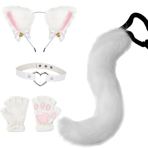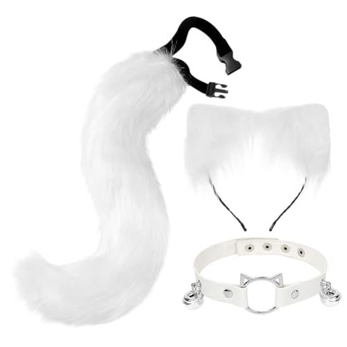 XEPST Faux Fur Cat Ears and Tail Set, Cat Cosplay Costumes Accessories Kit with Ears Headband, Bell Choker, Tail for Animal Dress Up, Halloween Party Costume, White